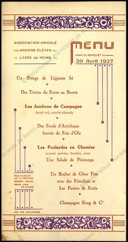Menu du Banquet du 30 avril 1927 / Association Amicale des Anciens élèves du Lycée de Reims