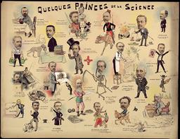 Quelques princes de la Science : Docteurs Robin, Jolicoeur, Seuvre, Knoeri, Lévèque, O. Guelliot, Colleville, Pozzi, Decès, A. Henrot, Panis, H. Henrot, Strapart, Langlet, Wiet, Moret, Thomas et H. Chevrier / 1 planche de portraits-charges signée Tristan de Pyègne, décembre 1893